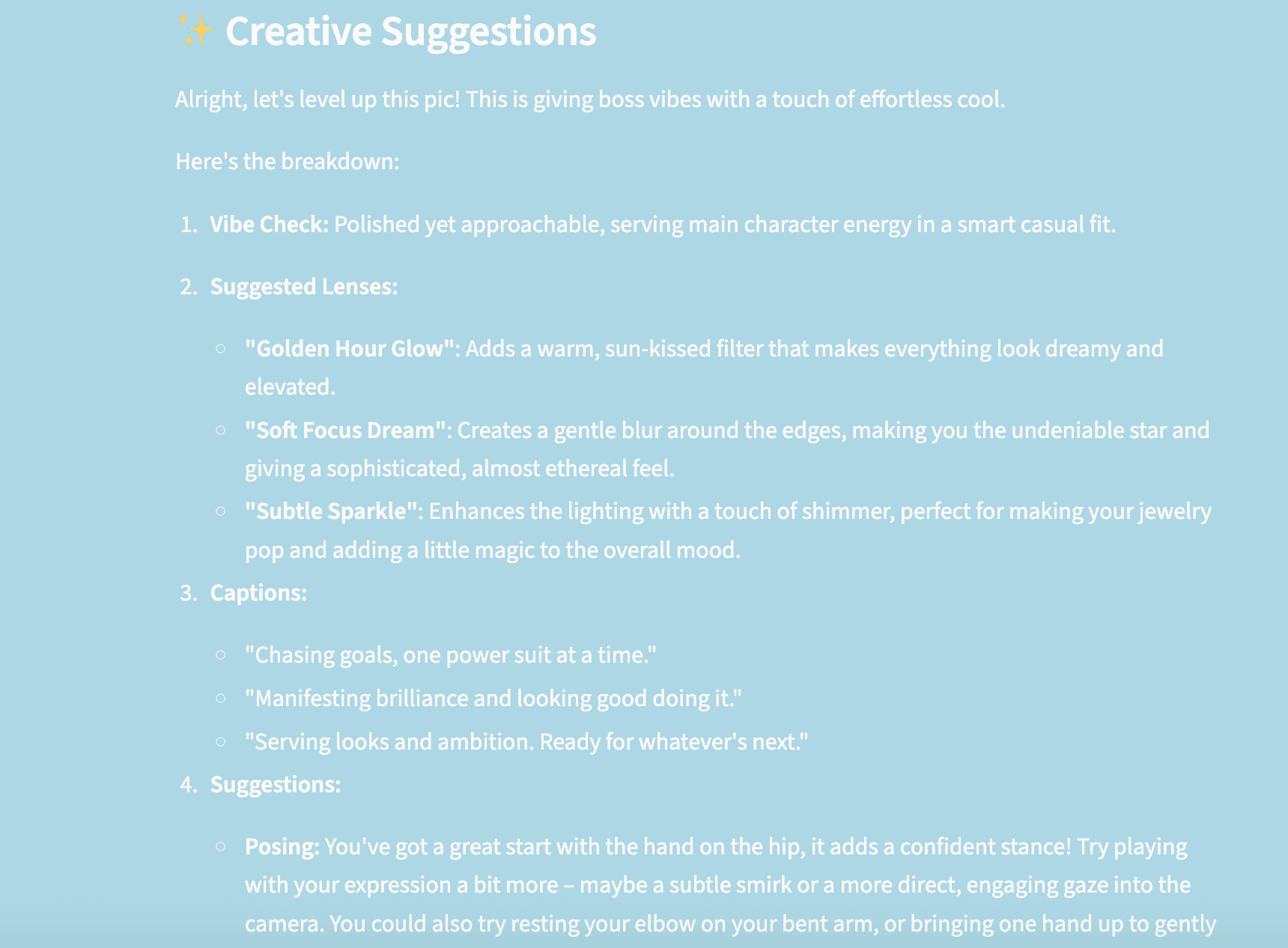 Engineered a real-time multimodal AI assistant to eliminate the creative friction of photography and content creation. By integrating Gemini 2.5 Flash with a Python/Streamlit architecture, the app performs instant visual analysis to provide context-aware posing tips, AR lens recommendations, and trendy captions. This tool streamlines the journey from 'camera-shy' to 'post-ready,' allowing users to focus on the moment rather than the stress of getting the perfect shot.
